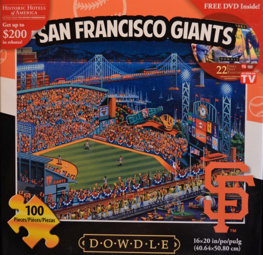While others may dabble in this trend, for me it’s become an addiction. It started when I found an unopened puzzle I had given my mother-in-law as a Christmas gift two years earlier: It was a Dowdle puzzle, the brand that Costco loves to sell by the pallet-fulls. An SF Giants puzzle, 100 pieces! (Oops, guess I didn’t notice that it was a kiddie puzzle when I bought it) Well, I knocked it out in about an hour. By then the bug had pretty much infected me.