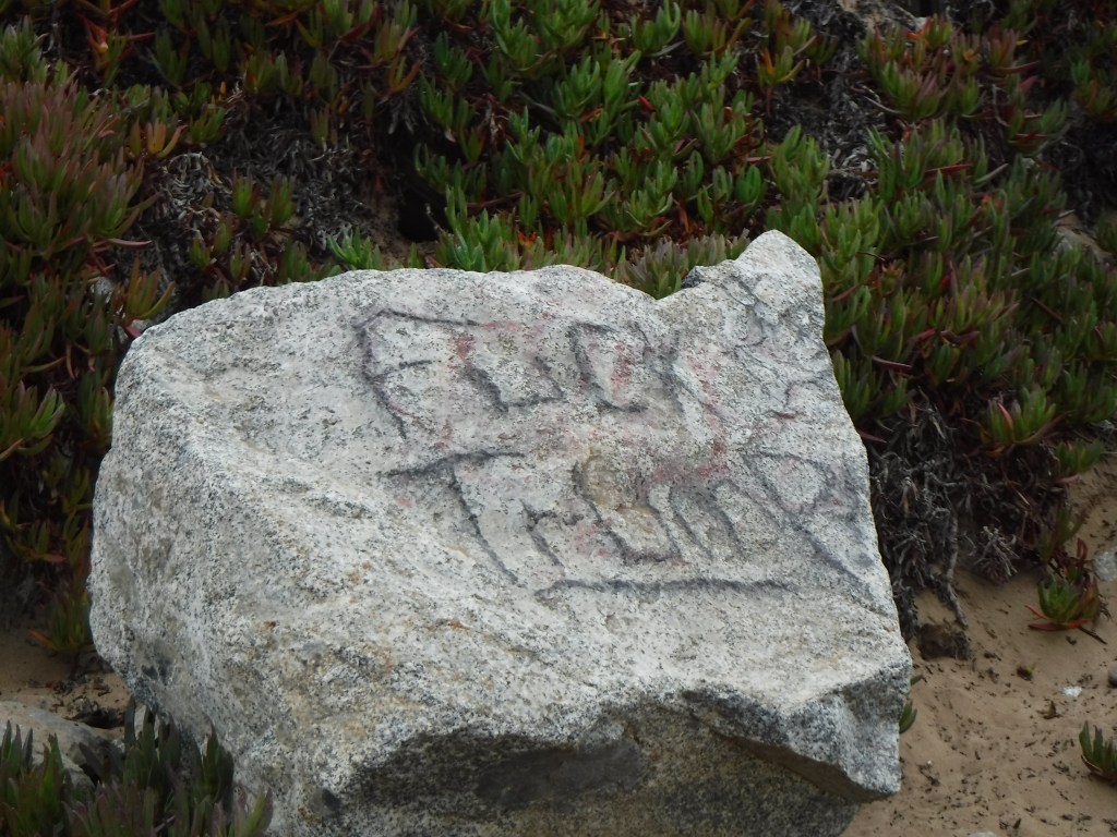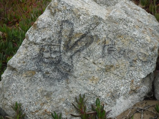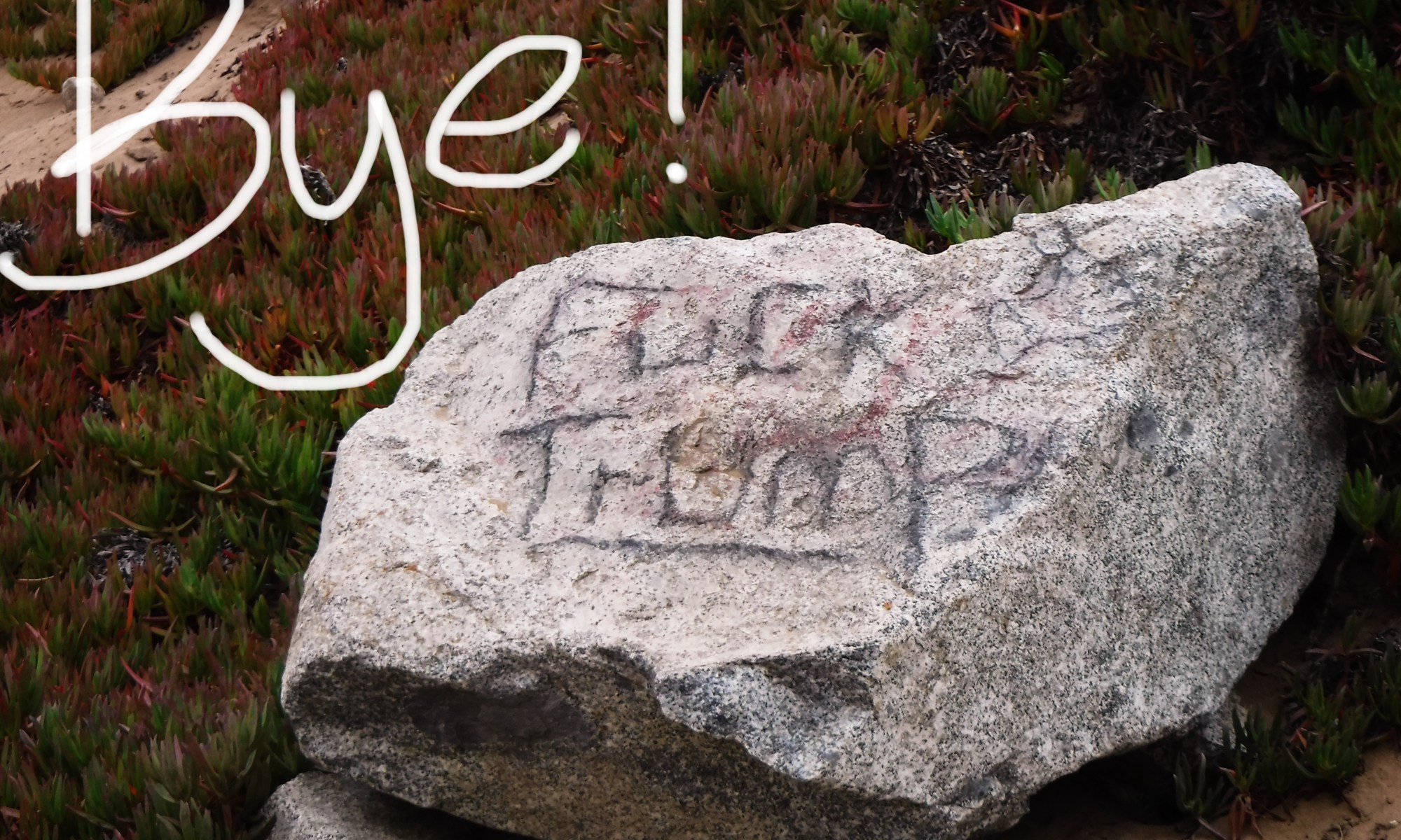The “Fuck Trump” rock: I came upon this at Fort Ord Dunes State Park near Monterey in 2019 — I was walking to the beach through the sandy trailed entrance (top photo) and as I got closer to the water, I looked left and saw the spray-painted messages of the big rock and its little sidekick stone glaring at me. Whipped out my cell phone and documented — it surely has since been scrubbed clean.