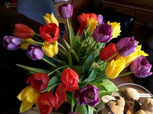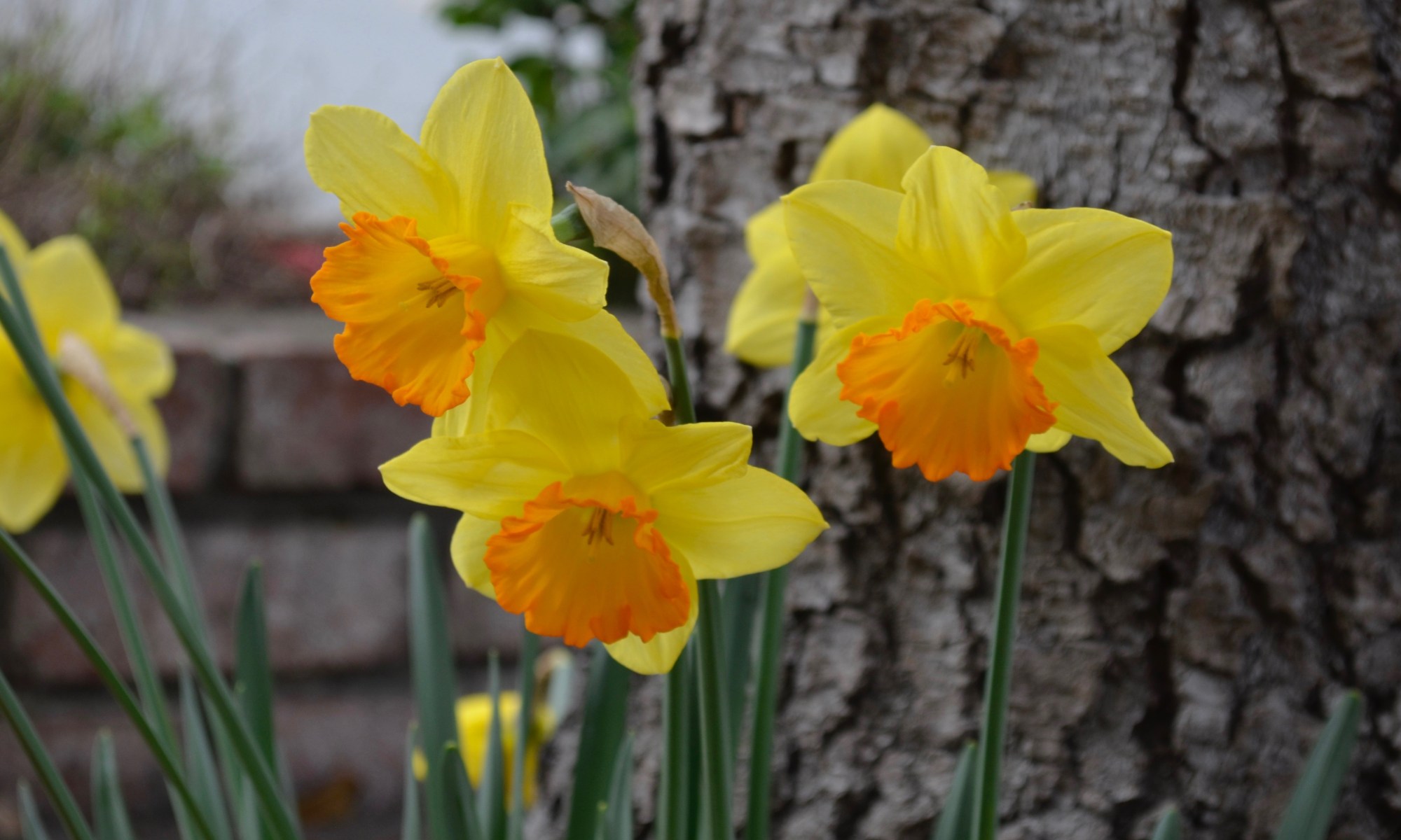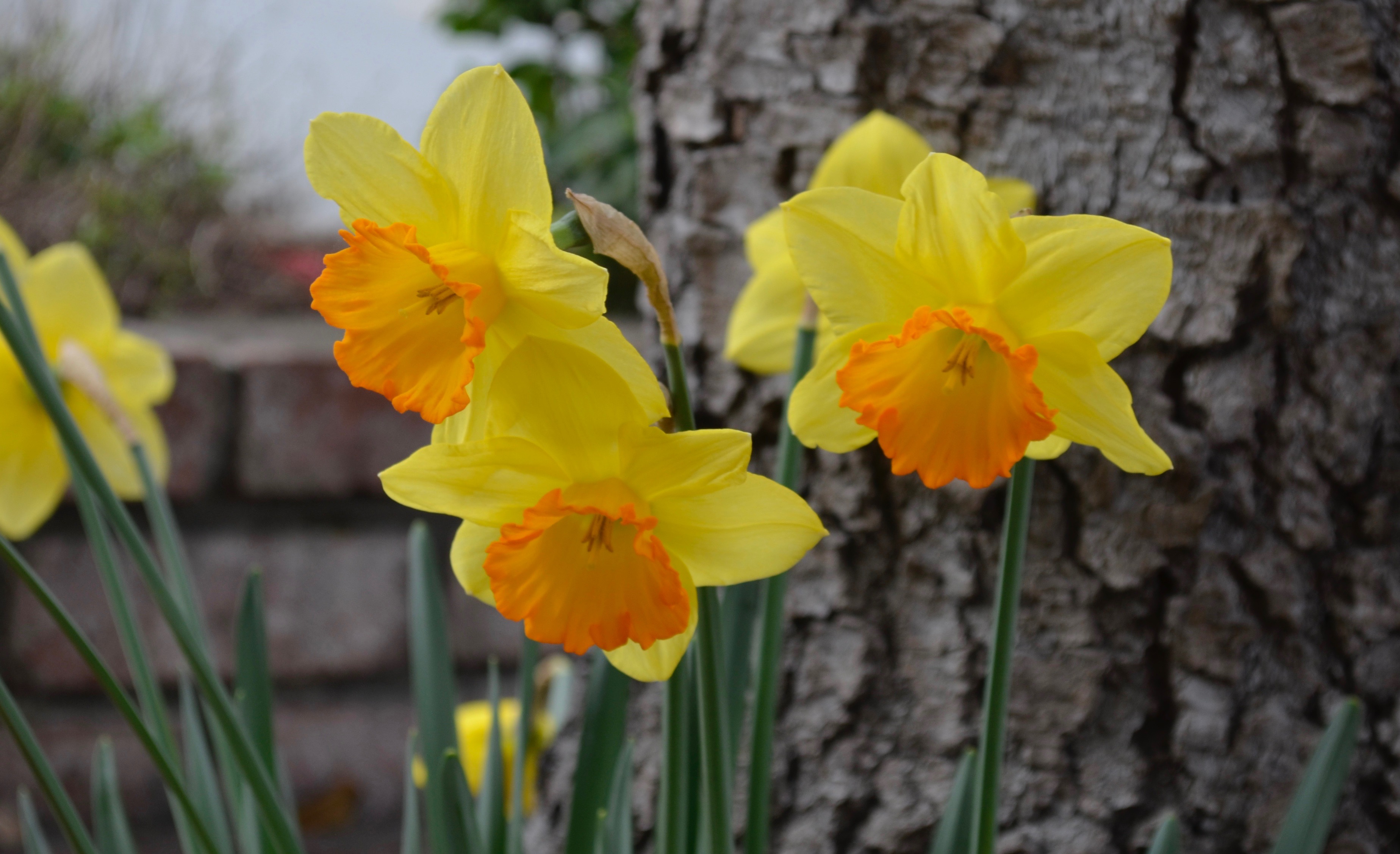Daffodils bring a splash of springtime color to our house here on the Central Coast. These beauties make an annual appearance next to a tree in the front yard. Stunning hues, yes, though actually the overcast skies here don’t seem to do the blooms justice, nor does the lazy photographer!