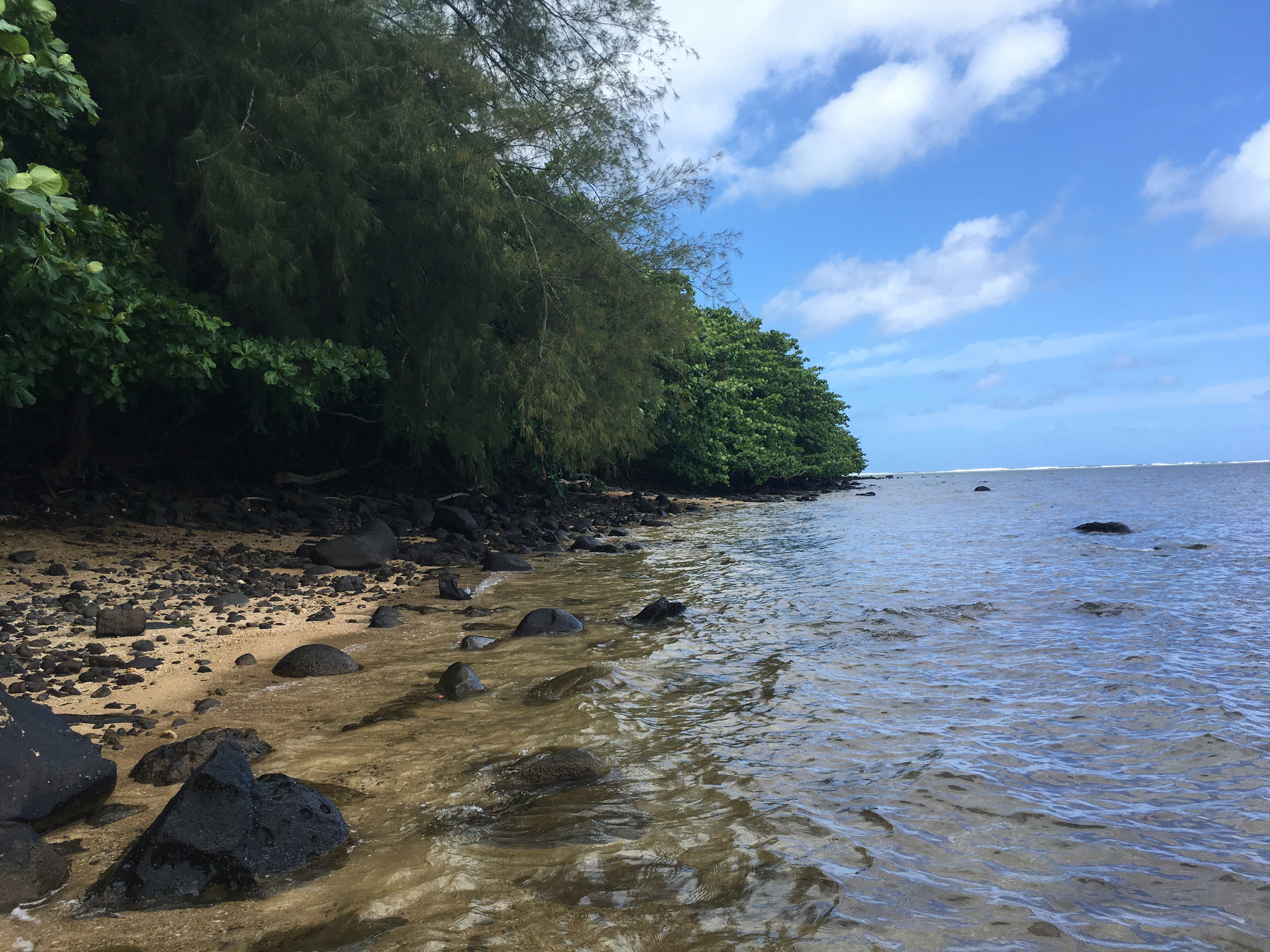 Lava rocks dot the shoreline at Anini Beach on the North Shore of Kauai