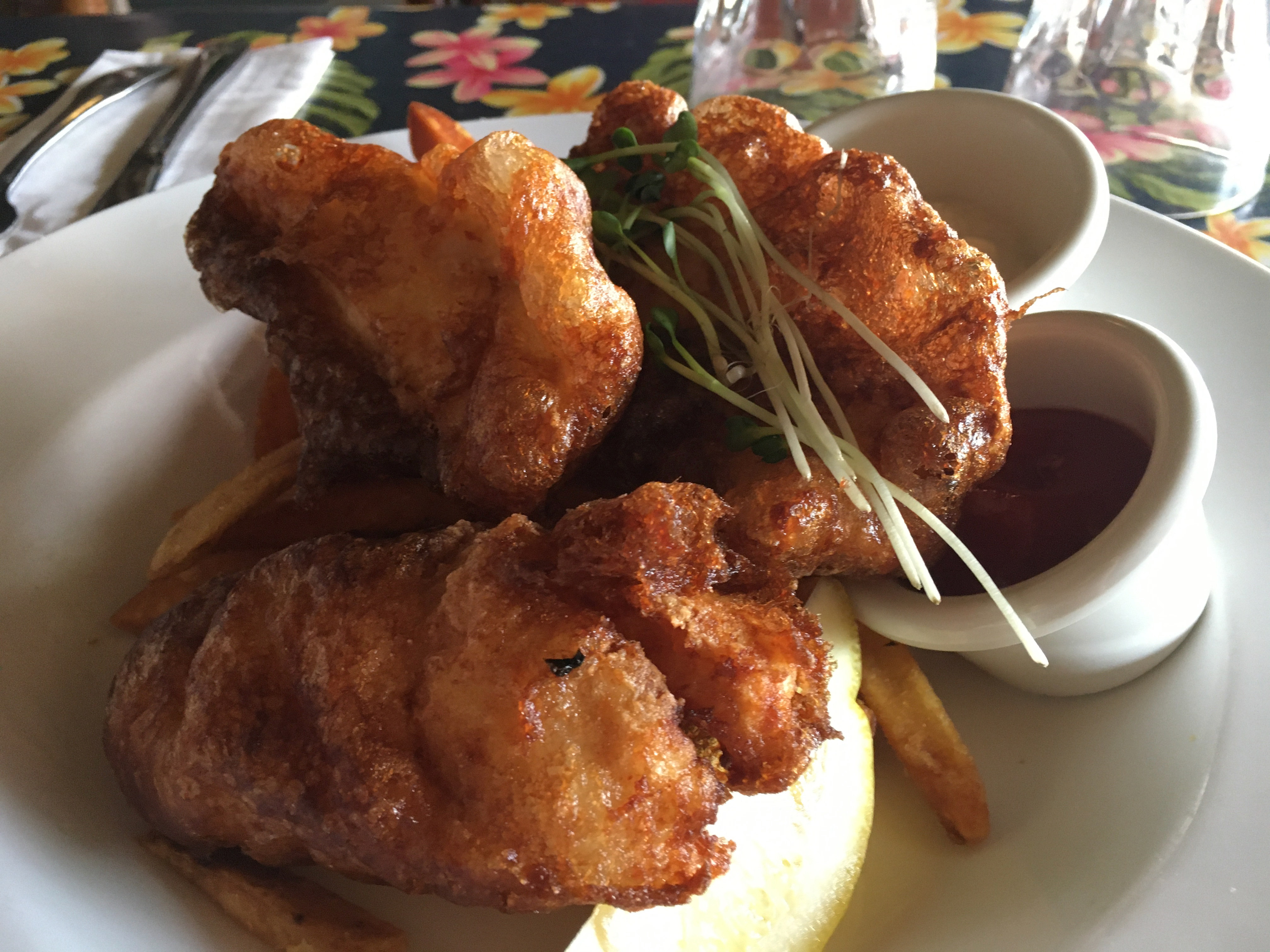 One disclosure: My server Teddy lets me know immediately that no chicken items on the menu are available. It’s a bit surprising but understandable, considering the pandemic, the sudden influx of tourists, the road conditions on the North Shore — possibly many obstacles in play (the irony of having chickens and roosters running around doesn’t escape me). So it is not a disappointment, and I opt for fish and chips, along with a caesar salad. Excellent choices — both are extremely delish.