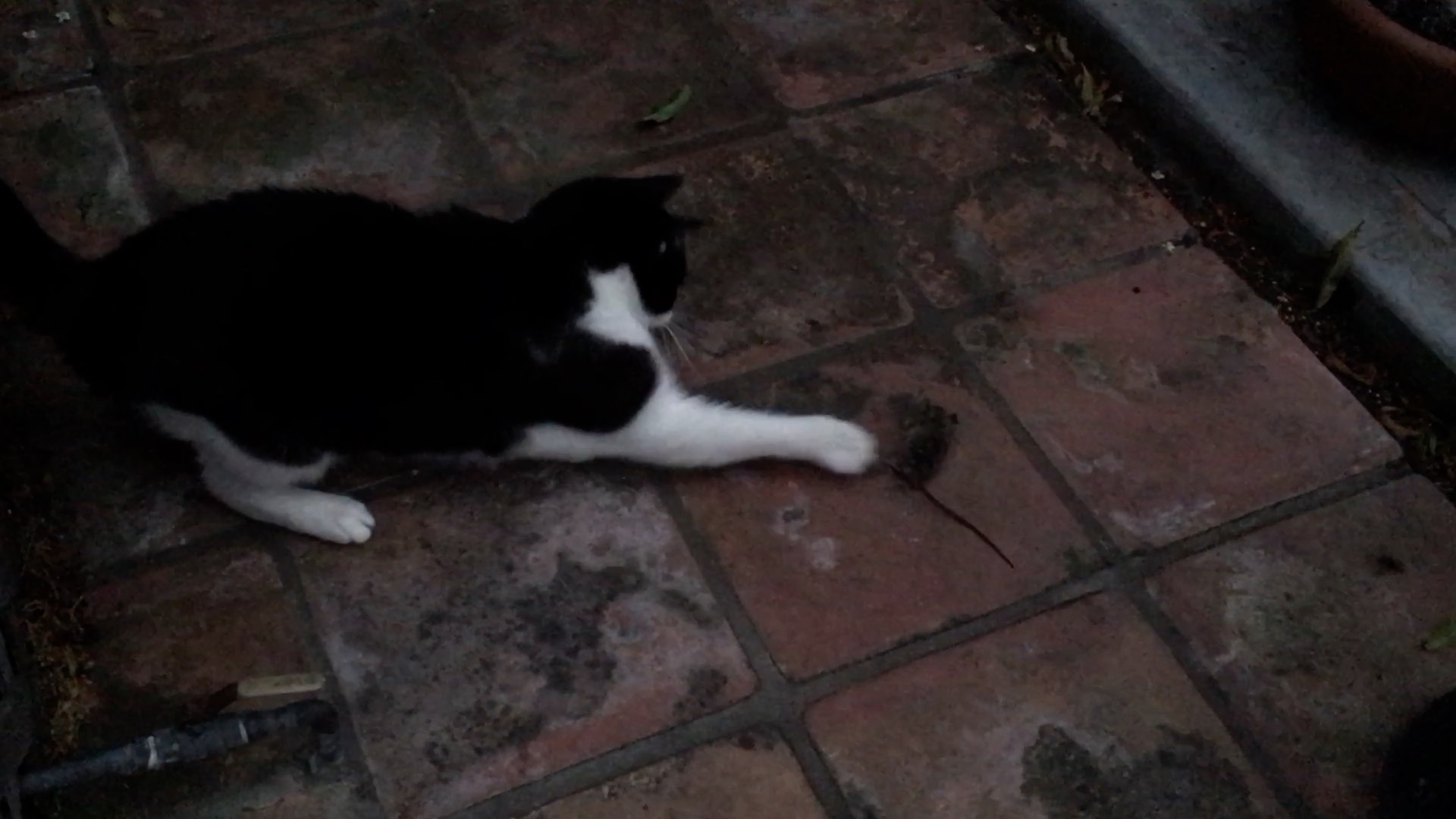 The cat violently drags the mouse into the house, triggering my sharp command to remove the nasty rodent, and kitty obliges, cornering and carrying it to the backyard, but it escapes and hides under some old beat-up wood decking, then tempts fate by peeking out and getting ensnared in kittyโs sharp clutches, only to be carried off and released once more, teasingly hiding amid the sad-looking potted plants, prolonging with sick glee the both oddly funny and potentially fatal game that goes on and on and would actually end with the likely wounded rat bastard still able to flee into the evening, having fully earned its satisfaction on the battleground vs. the spent kitty, while I am happy simply to have a house free of vermin.