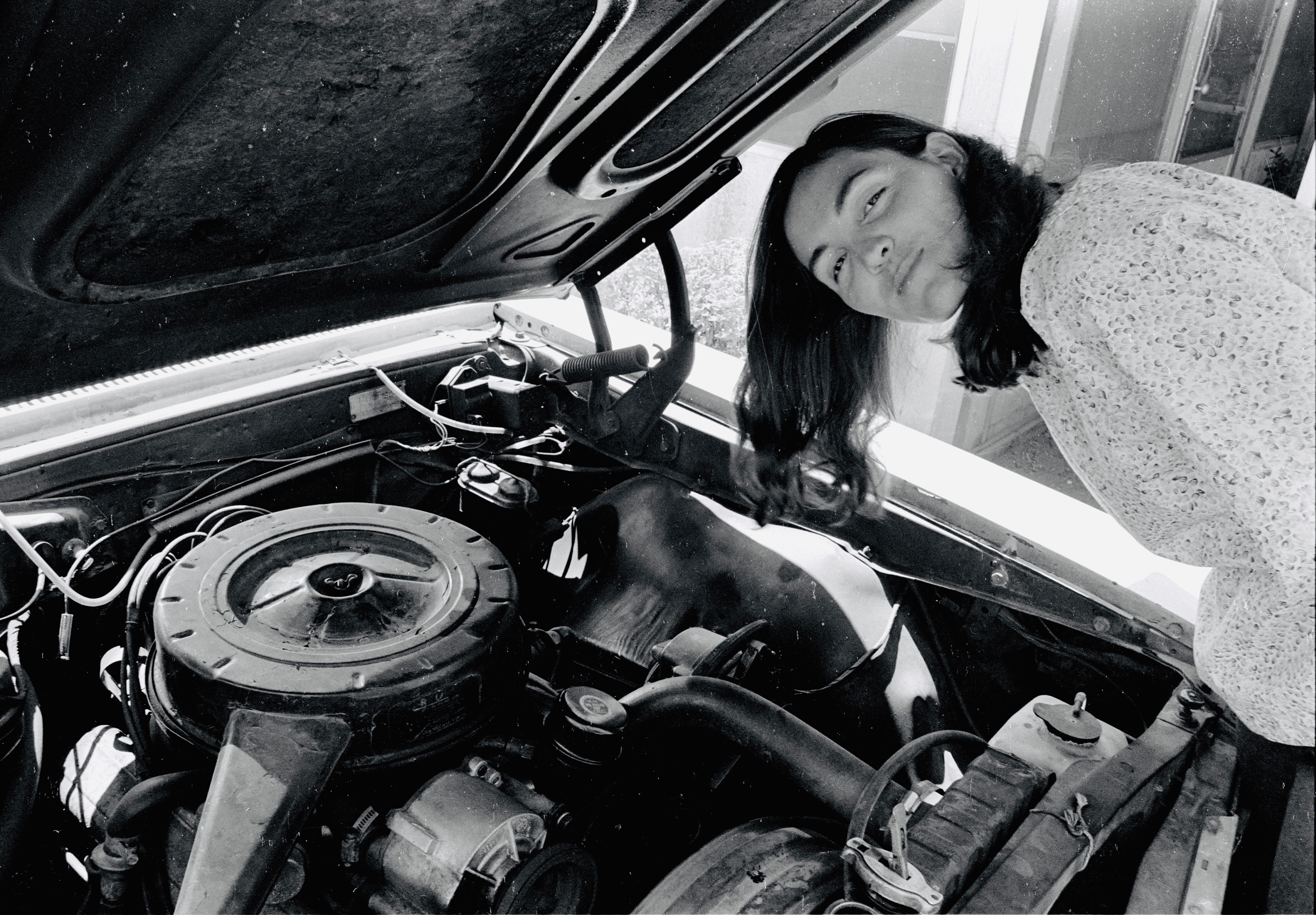 Under the hood of a 1967 Chevy Malibu, her longtime ride that was a hand-me-down from Ed. Carmen drove it before Helen. It was a two-door coupe with vinyl top, and a swapped-in 327 engine.