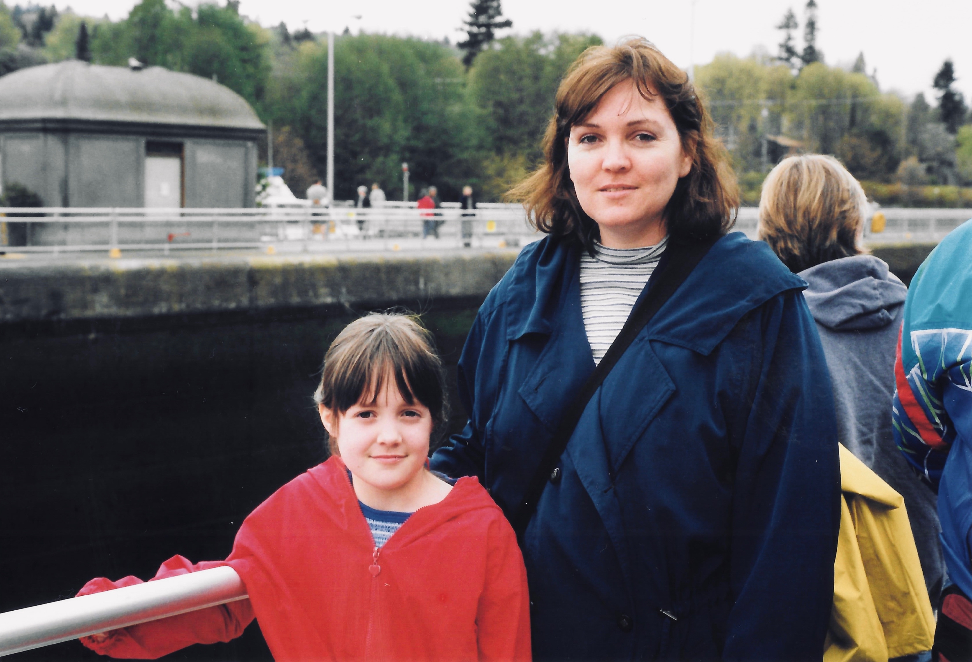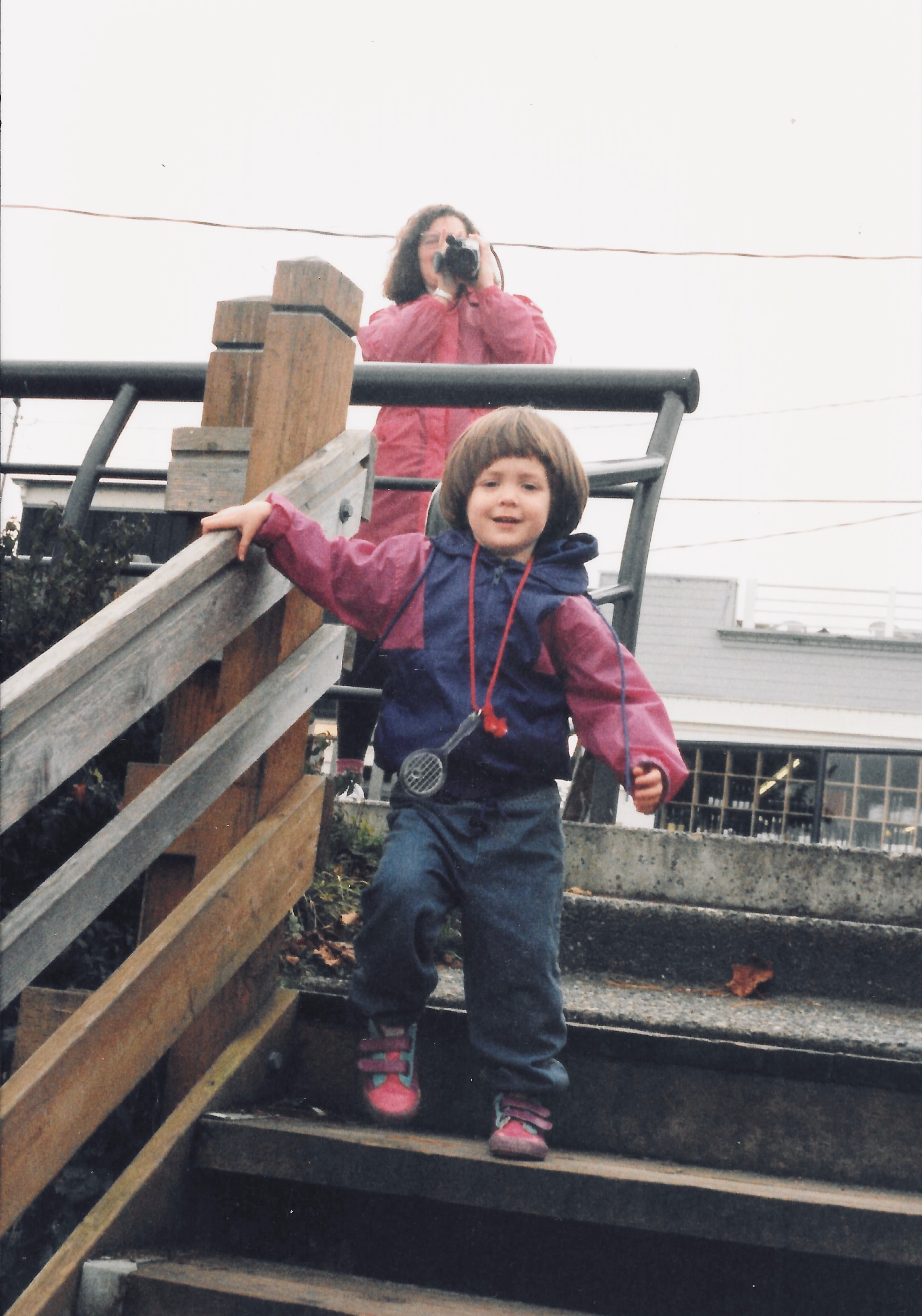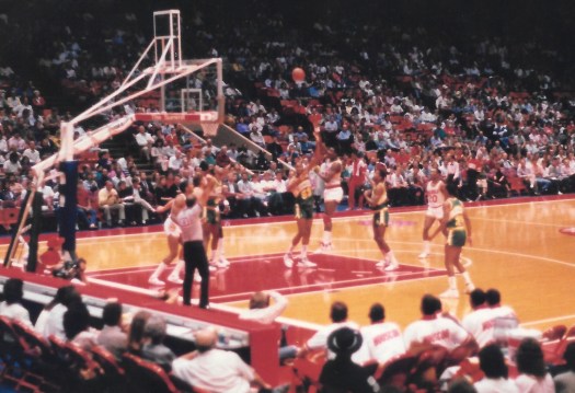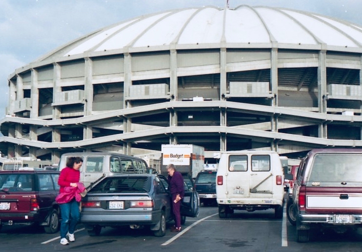 Helen and Bruce moved to Enumclaw, a town about an hour southeast of Seattle, a couple of years later. I went with Mom to visit them in November 1993; Lilly was not even 3 years old. We went lots of places, including taking a ferry ride to Whidbey Island; the Pike Place Market, Monorail and Space Needle. We also went inside the cavernous Kingdome for a holiday arts and crafts fair — this was less than a year before a few large ceiling tiles famously fell inside the place (whew, dodged a bullet), which eventually was demolished in 2000. Helen took me to a Sonics-Bulls game at the Seattle Coliseum, where we had standing-room-only tickets on Horace Grant Goggles Night. Iโm pretty sure the Sonicsโ Sasquatch mascot was there, jumping on trampolines and stuff. Oh yeah, Michael Jordan had suddenly retired about a month earlier. Wouldnโt be seeing him; damn!