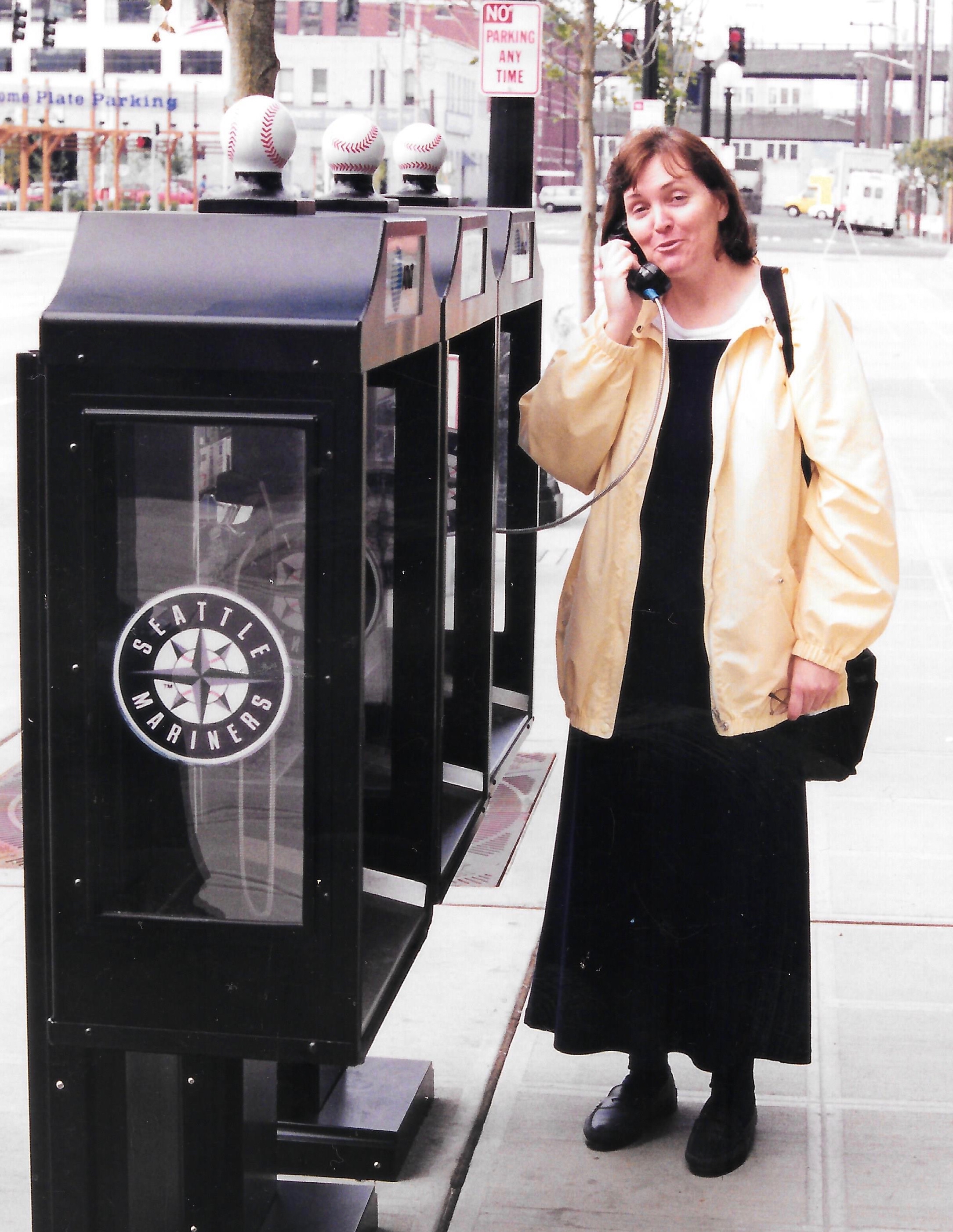 Top left: Helen videotapes Lilly on Whidbey Island; pretending to use a payphone outside the Mariners’ new ballpark in 1999; going to the Seattle Kingdome in 1993 for a holiday arts and crafts fair — it was HUGE.