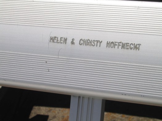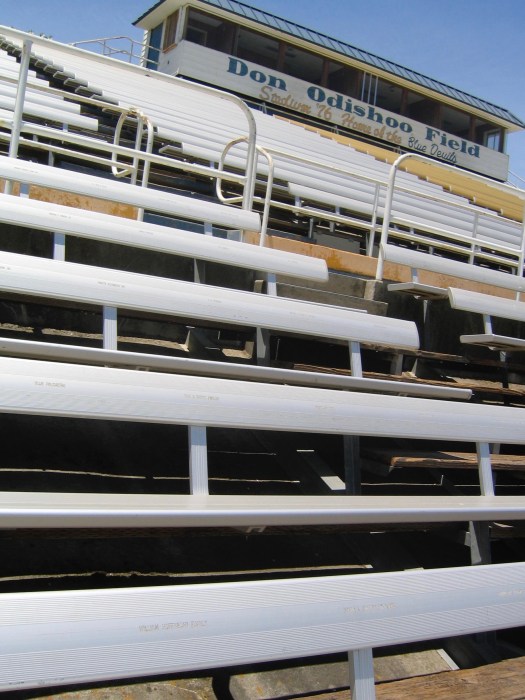 Stadium ’76 benches, Merced College. Last name misspelled.