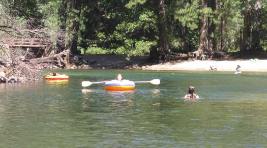 There were a few other memorable places I went with Helen: Yosemite Valley, late 80s, in January: we hiked the trail to Vernal Falls with snow on the ground. It was a great time. We didnโt go all the way, just to the bridge. Much later, about 2004 when she was battling cancer, we took Lilly on a snowboarding trip up near Strawberry past Pinecrest Lake. We also took Lilly to Yosemite, perhaps that year, and stayed in Housekeeping Camp, where we rafted lazily in the slow-moving Merced River.
