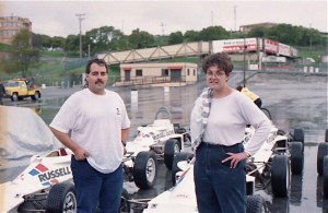 April 1, 1996: John Hermosillo, left, and Christy Hoffknecht stand near Formula cars on the track at Laguna Seca Raceway in Salinas.