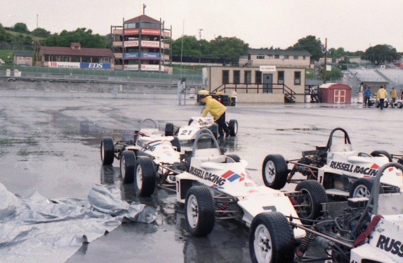 Our instructor started the day with a lesson on the cars and the racetrack. Drivers were handed zip-up fireproof coveralls to wear over our clothing. It was early afternoon, as I recall, by the time we went to the track, where two rows of Formula race cars were lined up. I faintly remember swapping an expression of doubt with John as each Test Drive student climbed into their assigned vehicles. I also recall a lack of concern about the weather on the part of anyone running the school. Us drivers essentially were told to take it slow and easy.