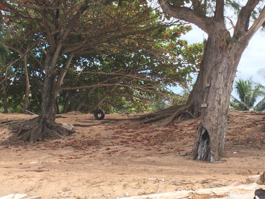 A tire swing hangs in the breeze.