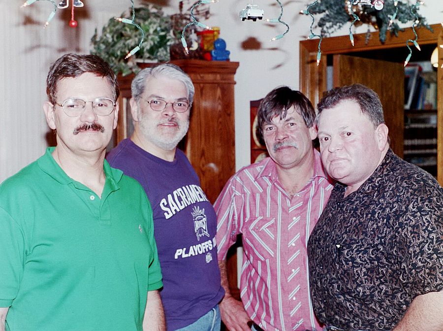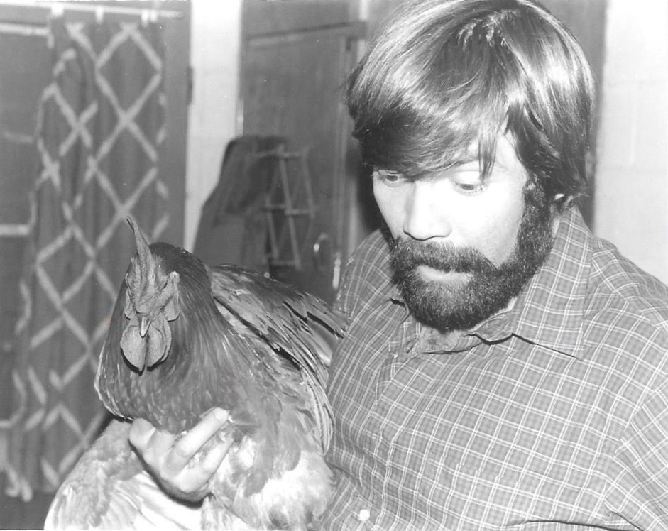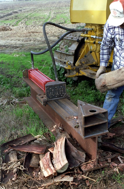 Profiles in bad-assness: Bill Hoffknecht demonstrates his custom-built log splitter, powered by Caterpillar tractor hydraulics! Note the “WJH” initials welded into the device, upper left. Photos by Fred Hoffknecht