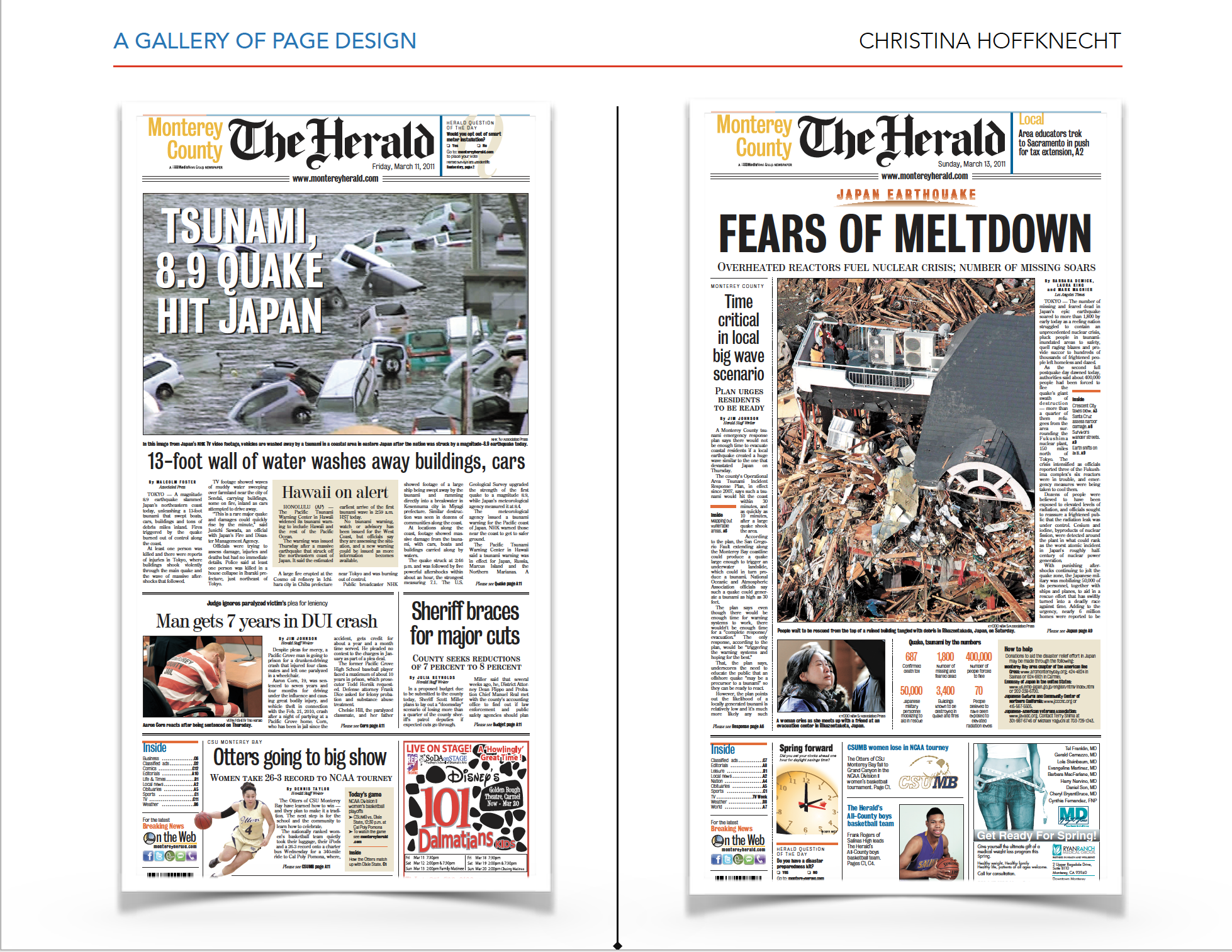 Portfolio A selection of front-page and section-front work at the Monterey Herald. https://christyhoffknecht.com/portfolio/resume/ Share this: Share on X (Opens in new window) X Share on Facebook (Opens in new window) Facebook Like Loading...